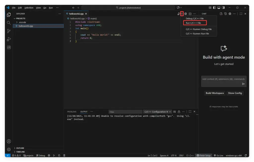 按Ctrl+S保存文件,点击编辑区域右上角的三角形按钮。选择Run C/C++ File选项。