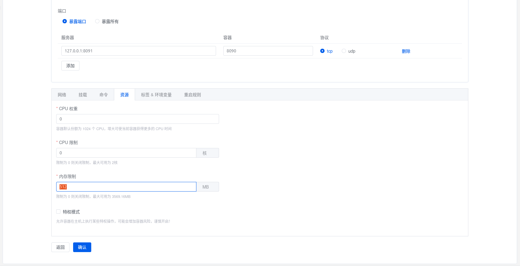 1. 翻到页面最低部,在卡片菜单栏选择“资源”,修改内存限制为512MB或更高。