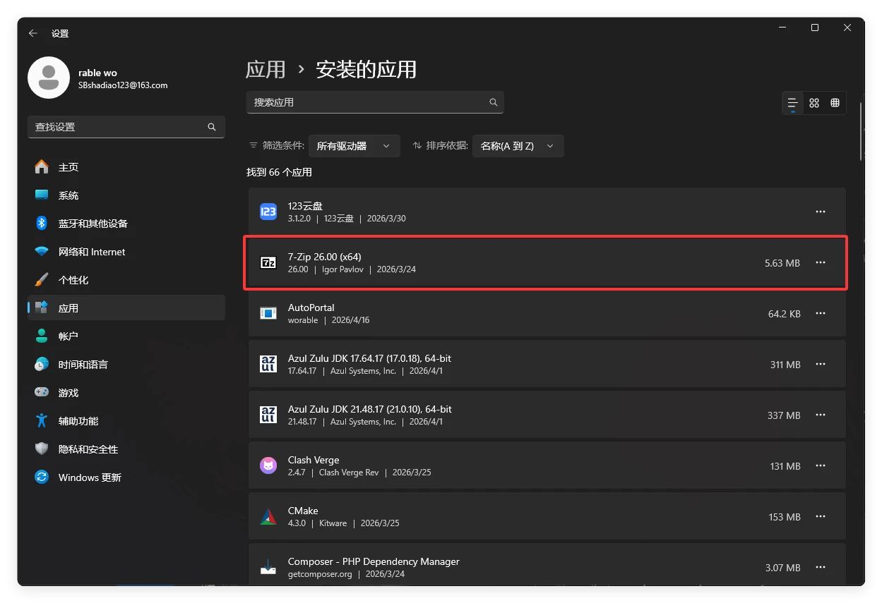 在 Windows 设置 → 应用中找到 7-Zip,点击卸载即可