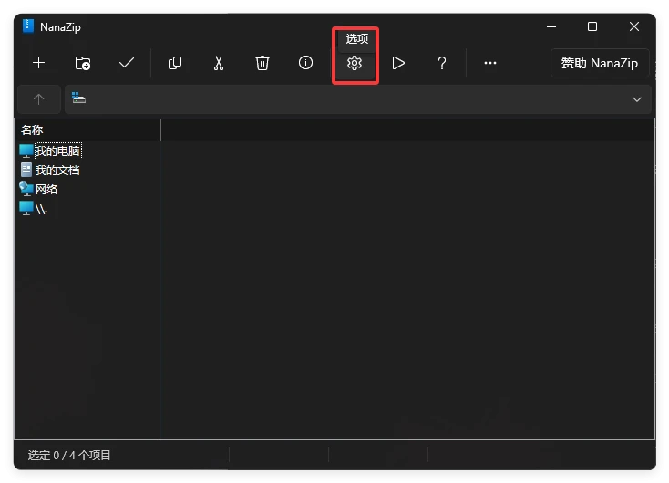 打开 NanaZip,点击菜单栏的 设置 选项