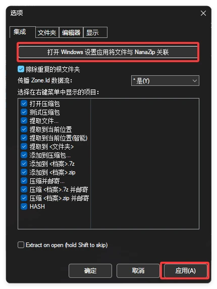 选择 打开 Windows 设置应用,将文件与 NanaZip 关联