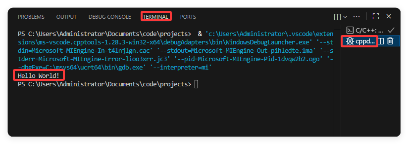 Hello World!后面的区域你自己再探索吧!官方文档指引:https://code.visualstudio.com/docs/cpp/config-mingw#_understanding-tasksjson