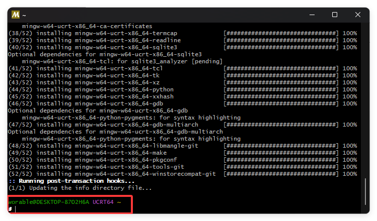 在这个终端中,通过执行以下命令安装 MinGW-w64 工具链: