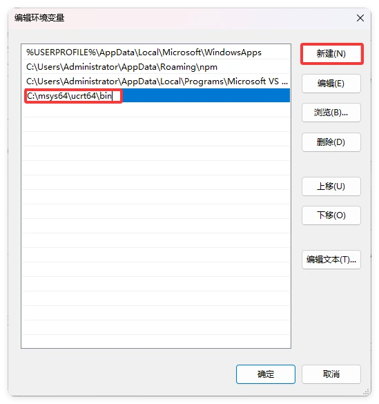 选择新建,并将你在安装过程中录制的 MinGW-w64 目标文件夹添加到列表中。如果你使用了上述默认设置,则路径如下: C:\msys64\ucrt64\bin