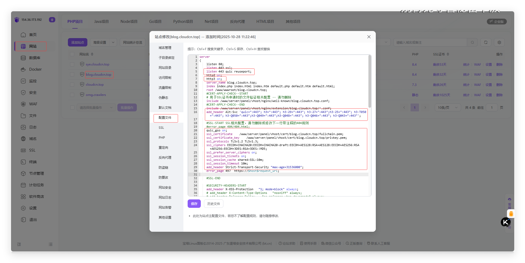 ssl_protocols TLSv1.2 TLSv1.3; #确保这行有TLS1.3,因为HTTP/3需要在TLS1.3上运行。